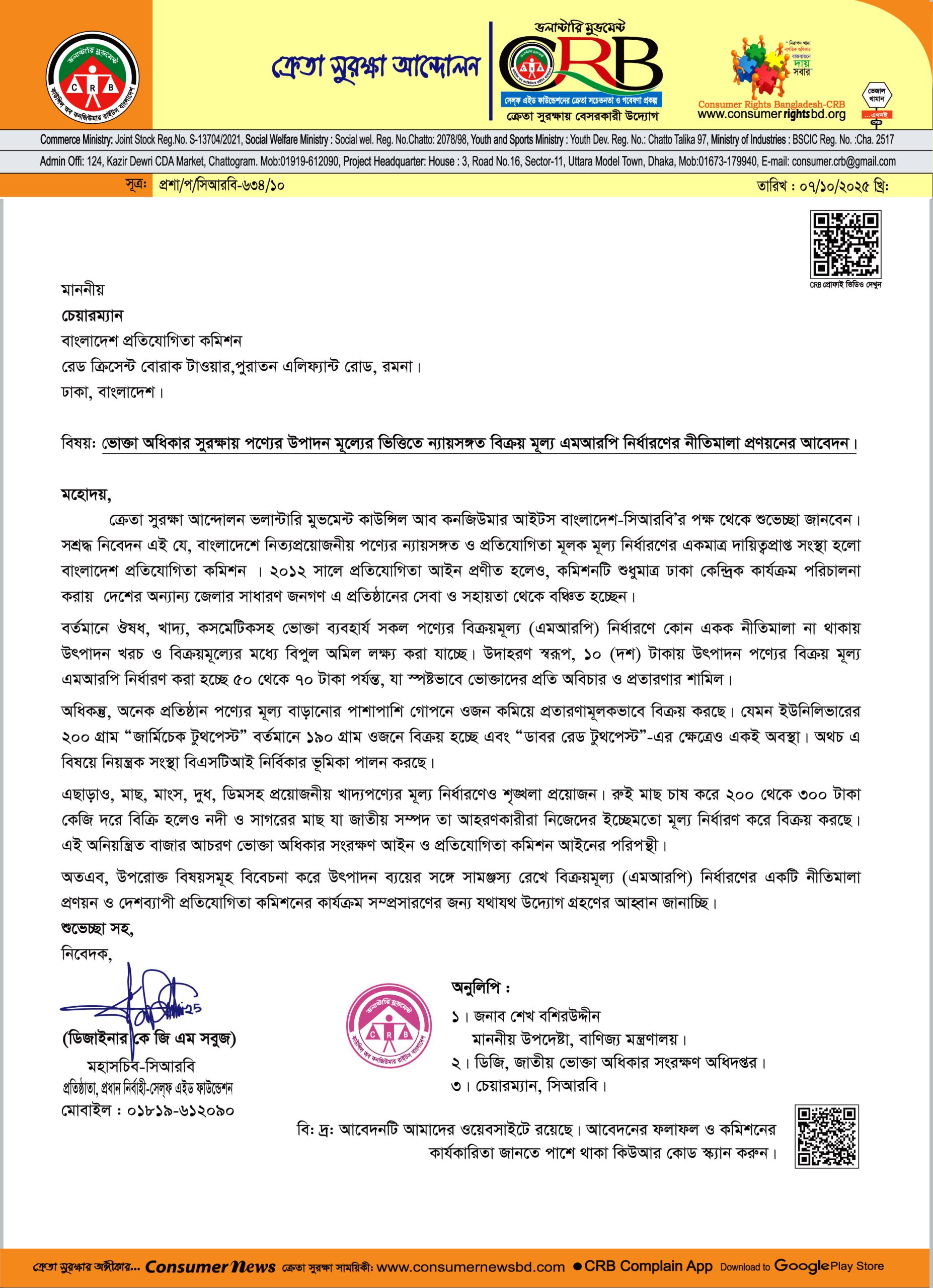 ভোক্তা অধিকার সুরক্ষায় পণ্যের উপাদন মূল্যের ভিত্তিতে ন্যায়সঙ্গত মূল্য নির্ধারণের নীতিমালা প্রণয়নের আবেদন।
