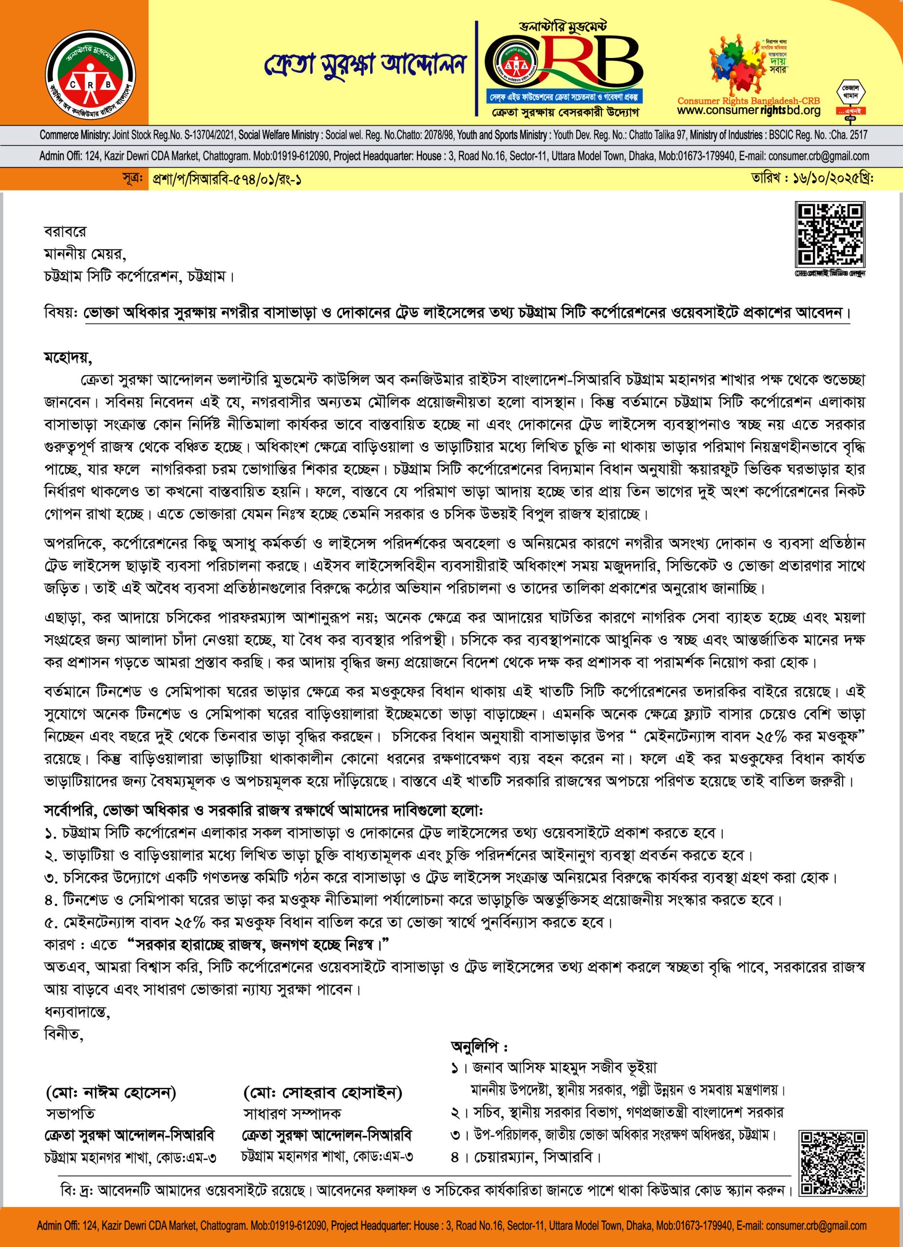 বাড়ীভাড়া ও ট্রেড লাইসেন্সের তথ্য ওয়েবসাইটে প্রকাশের চসিক মেয়রকে সিআরবি’র আবেদন