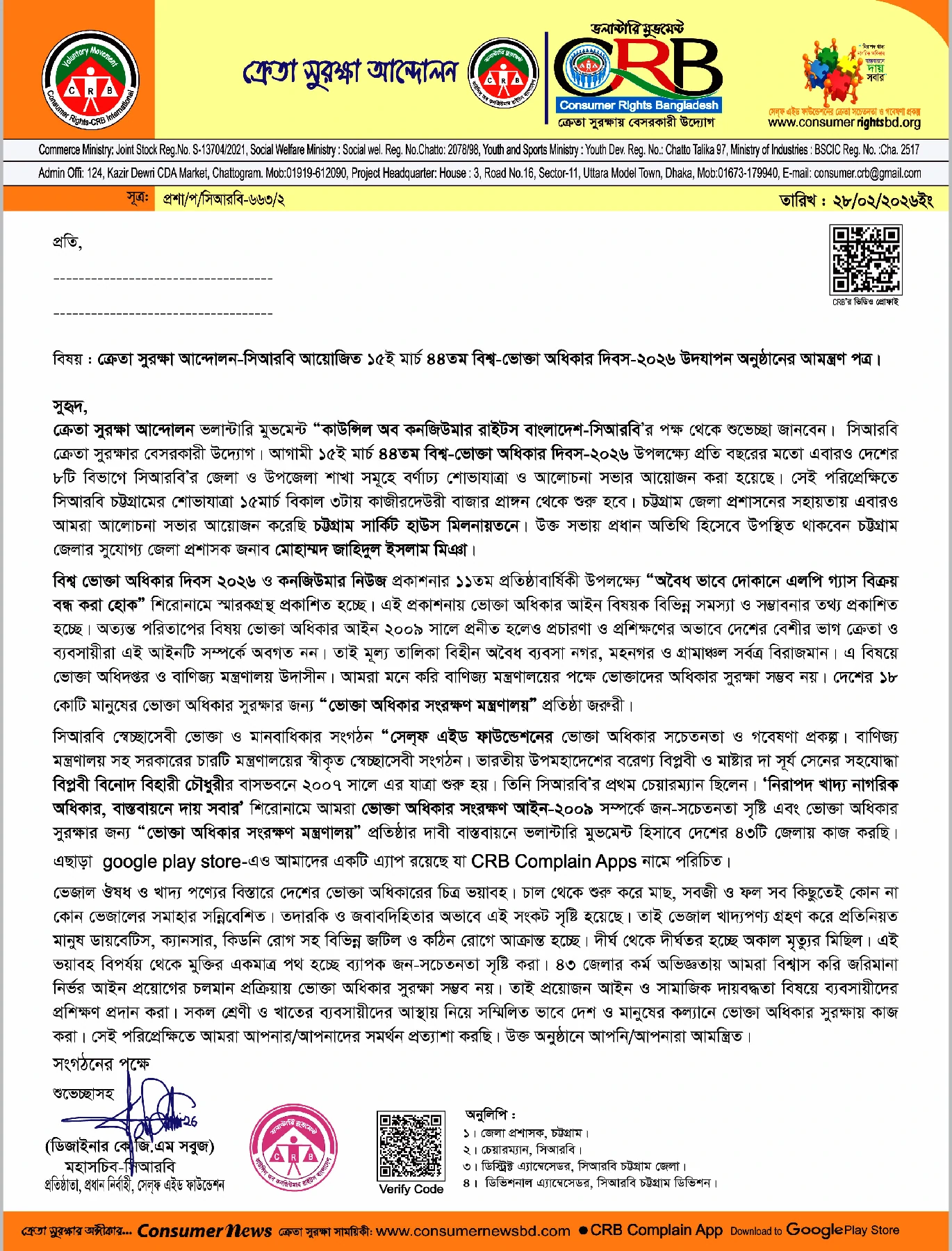 Invitation letter to traders for the 44th World Consumer Rights Day-2026 celebration organized by CRB on March 15.