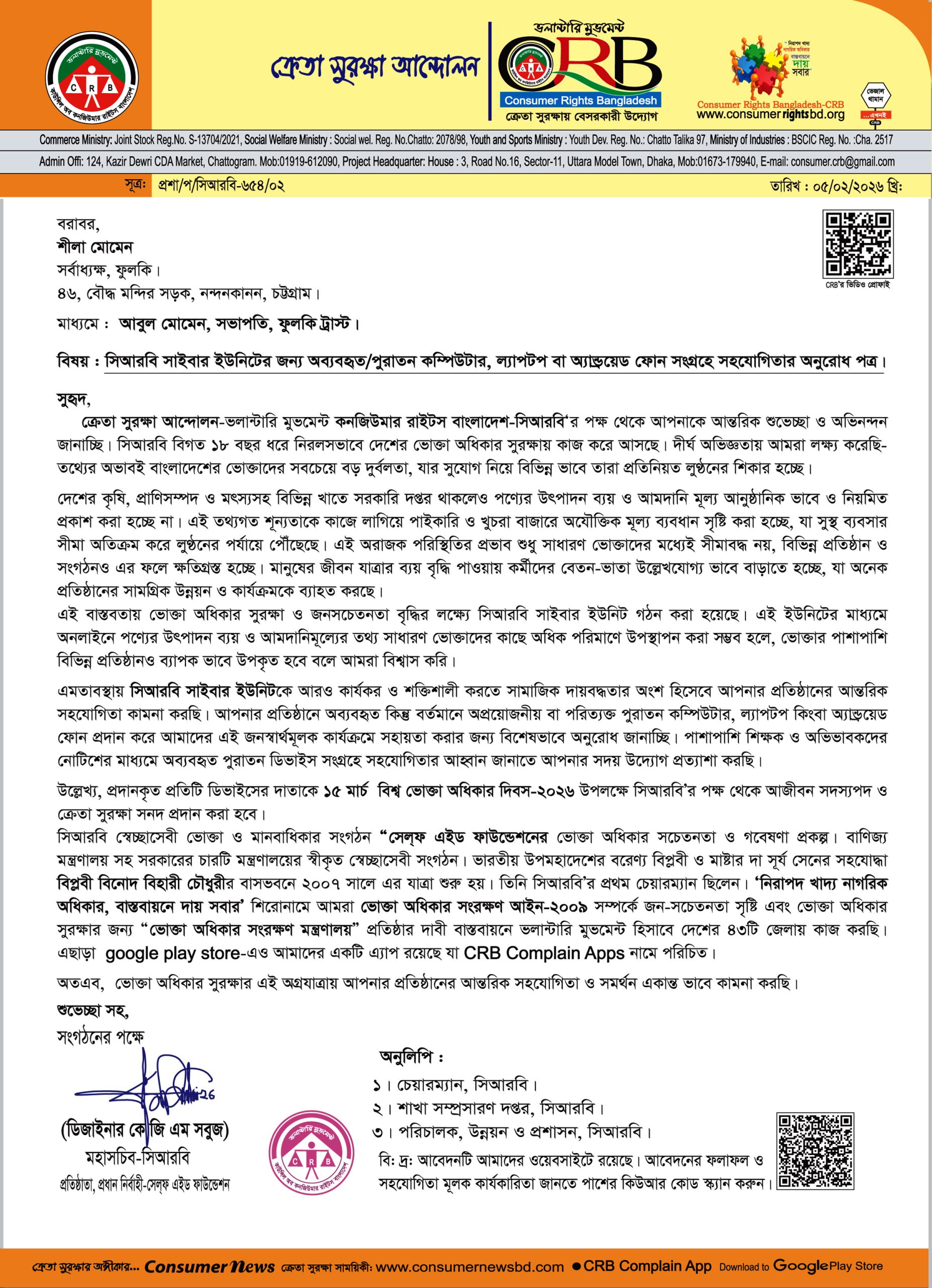 সহজপাঠ ফুলকি স্কুলে : সিআরবি সাইবার ইউনিটের জন্য ব্যবহৃত/পুরাতন কম্পিউটার, ল্যাপটপ বা অ্যান্ড্রয়েড ফোন সংগ্রহে সহযোগিতার অনুরোধ পত্র।