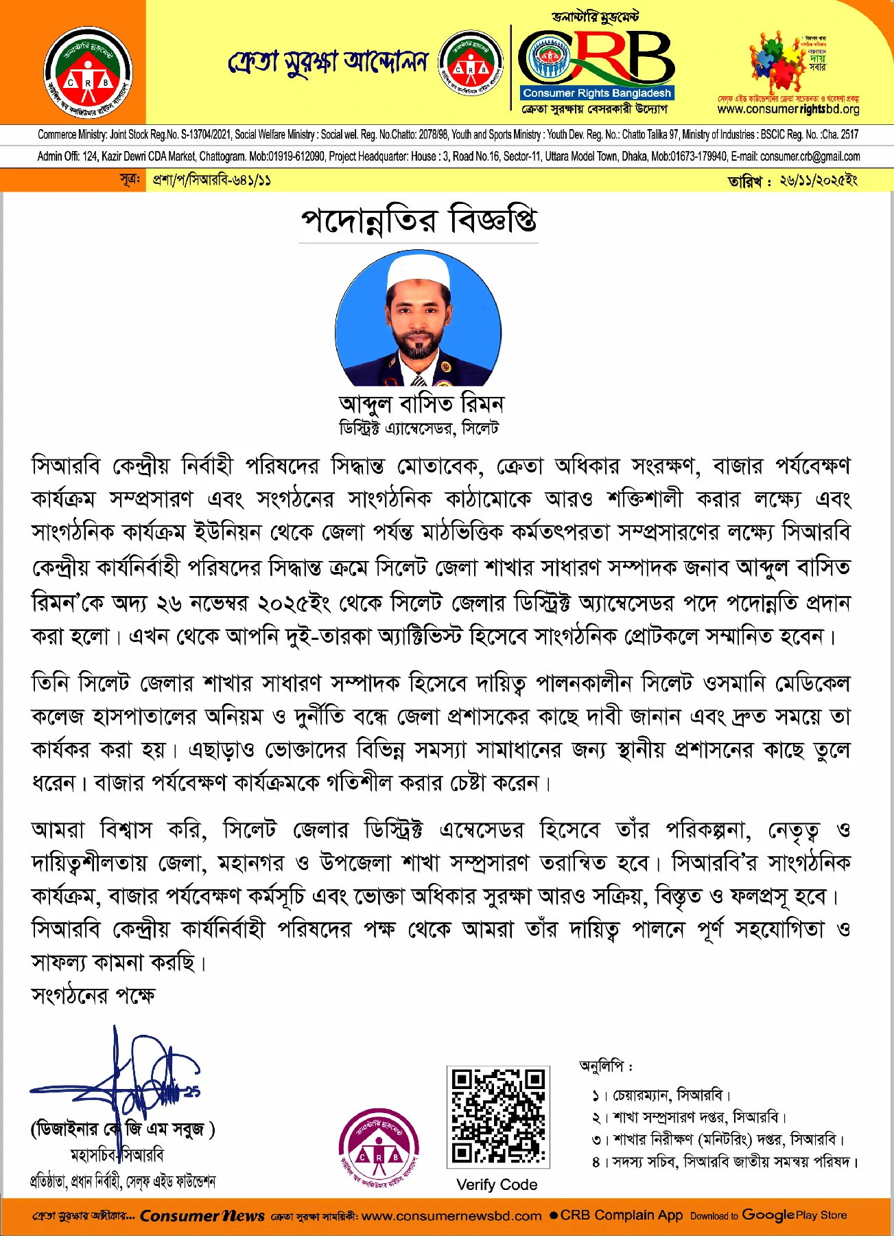 সিলেট জেলার ২০২৫–২০২৭ সালের জন্য সিআরবি’র মনোনীত ডিস্ট্রিক্ট এ্যাম্বেসেডর